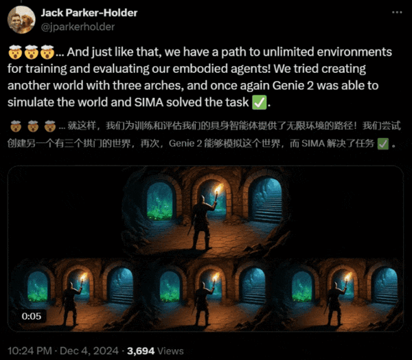 谷歌研究人员Jack Parker-Holder也给出了两个实例,用户只需供给一张由Imagen 3生成的图像和响应的文字描述,